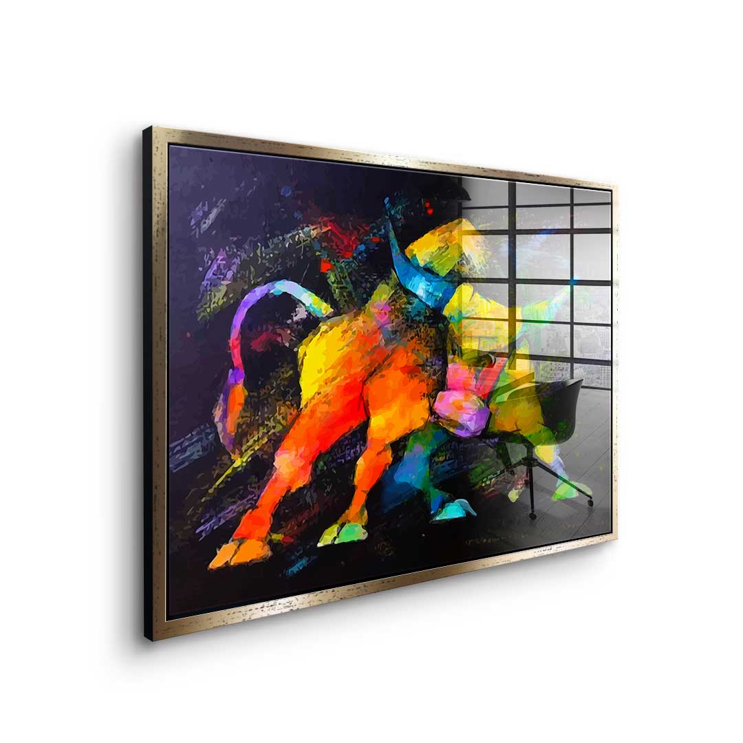 DOTCOMCANVAS® Premium Acrylglasbild im Pop Art Stil mit wildem Bullen in bunten Farben.