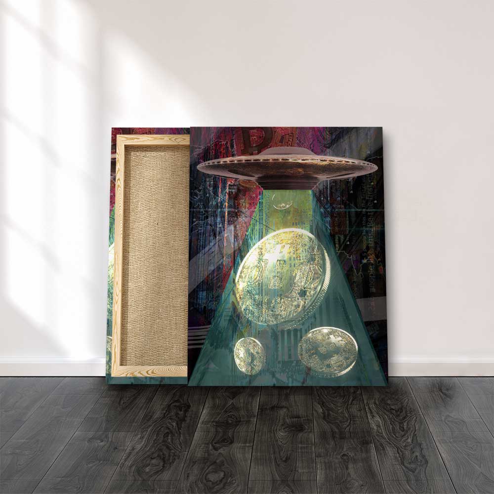 DOTCOMCANVAS® Wandbild Business Bitcoin Kryptowährung Geld Alien Schiff Gold Rosa Grün Bitcoin Aliens